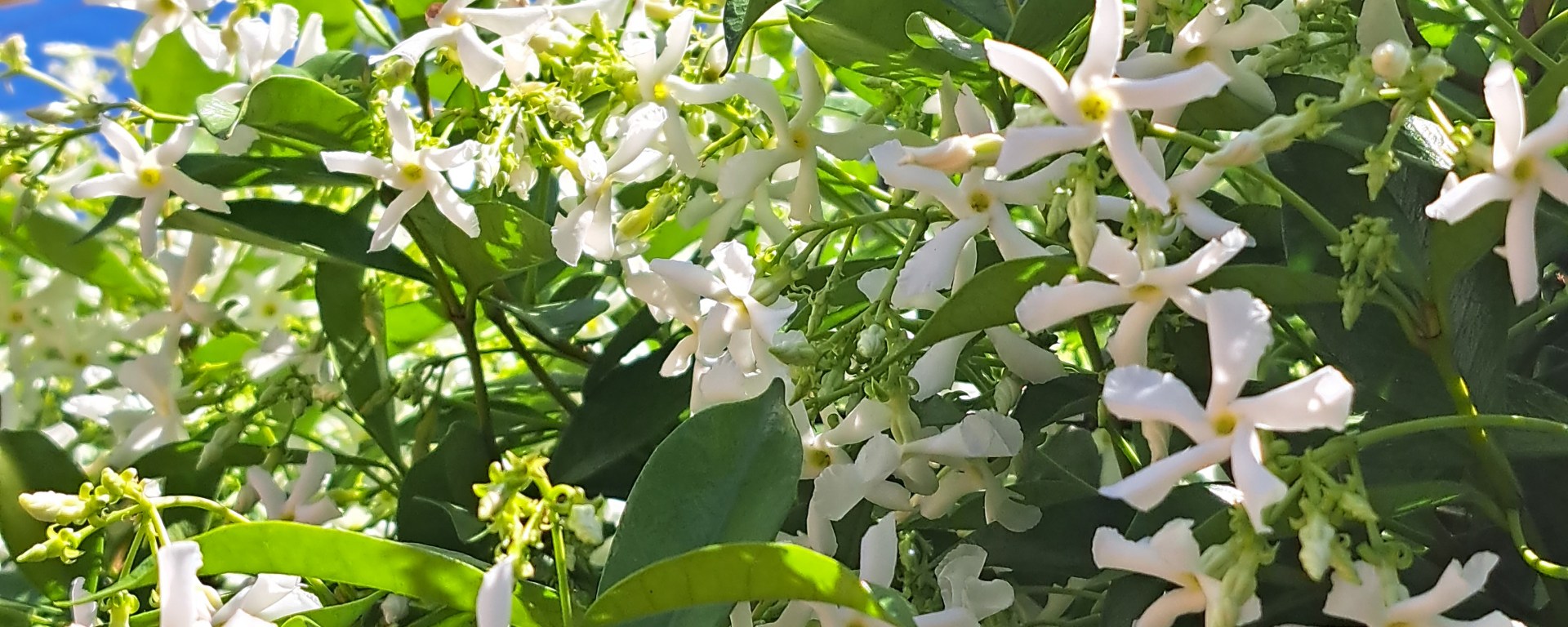 The scent of jasmine wafts gently in the spring breeze. White jasmine is good friends with the blue sky. The fragrance of flowers dances happily in the heart and enriches the soul. What is your favourite floral fragrance?